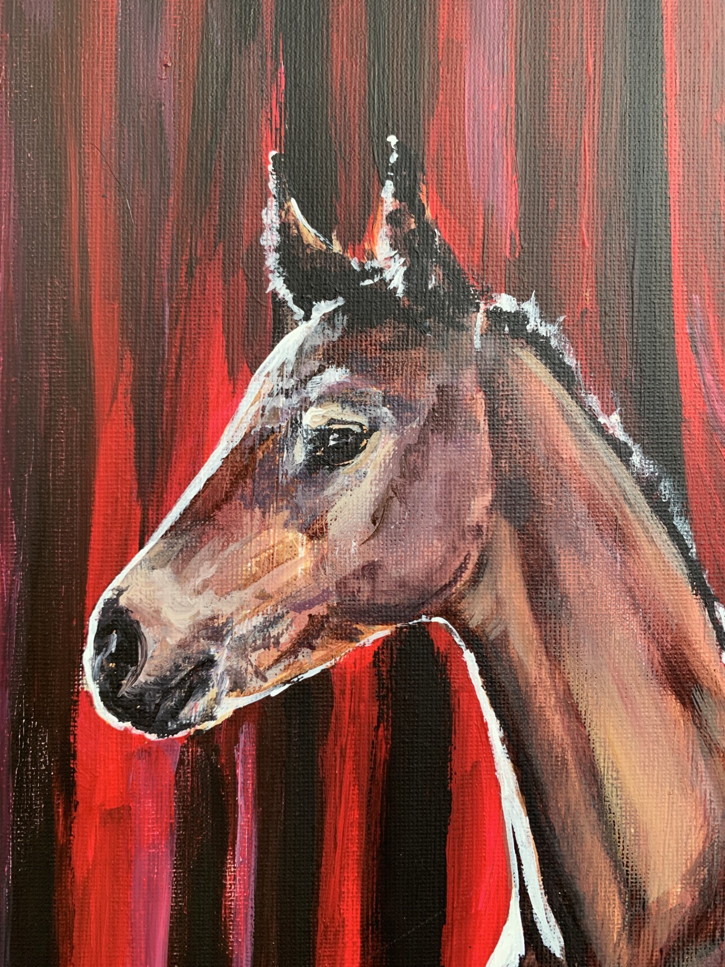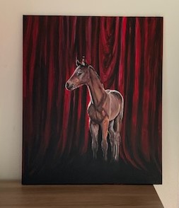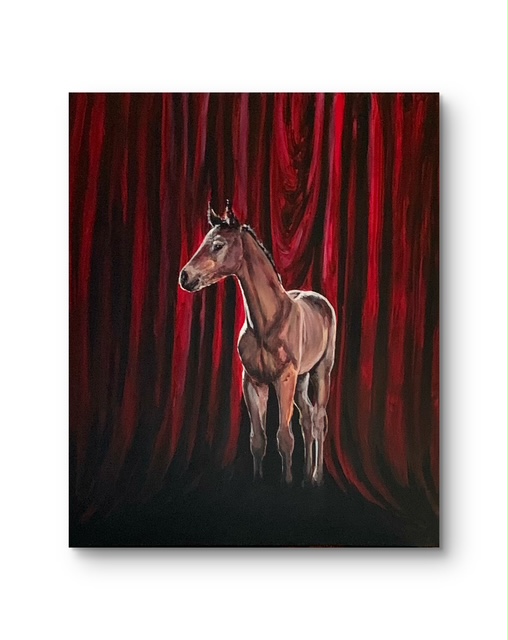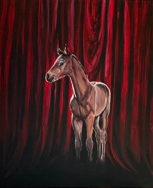 Halusin luoda jotain värikästä, ja tähän maalaukseen valikoitui hevoseksi tämä varsa, joka on ehkä tulevaisuuden toivo, tai kuvaa sitä hetkeä kun pitää lähteä yksin suurelle näyttämölle eli maailmaan. Tällä varsalla on kaikki kuitenkin hyvin, se näyttää valppaalta mutta tyyneltä, vaikka spottivalot jo osoittavatkin siihen.