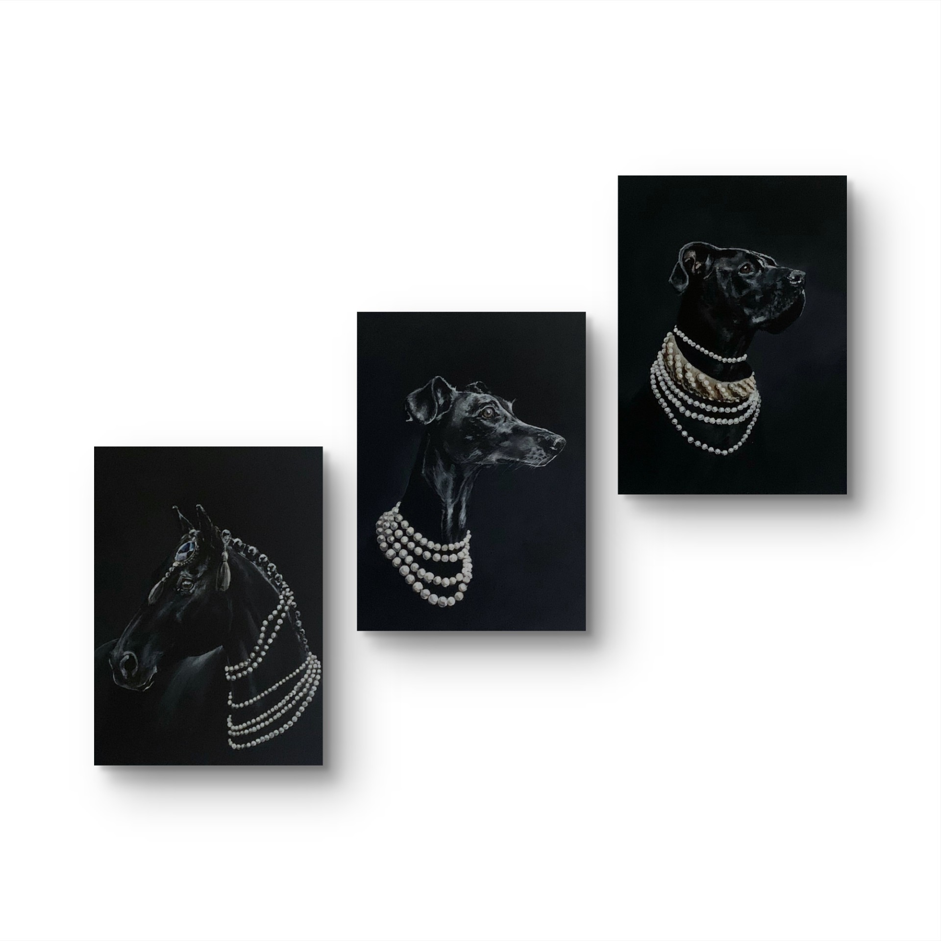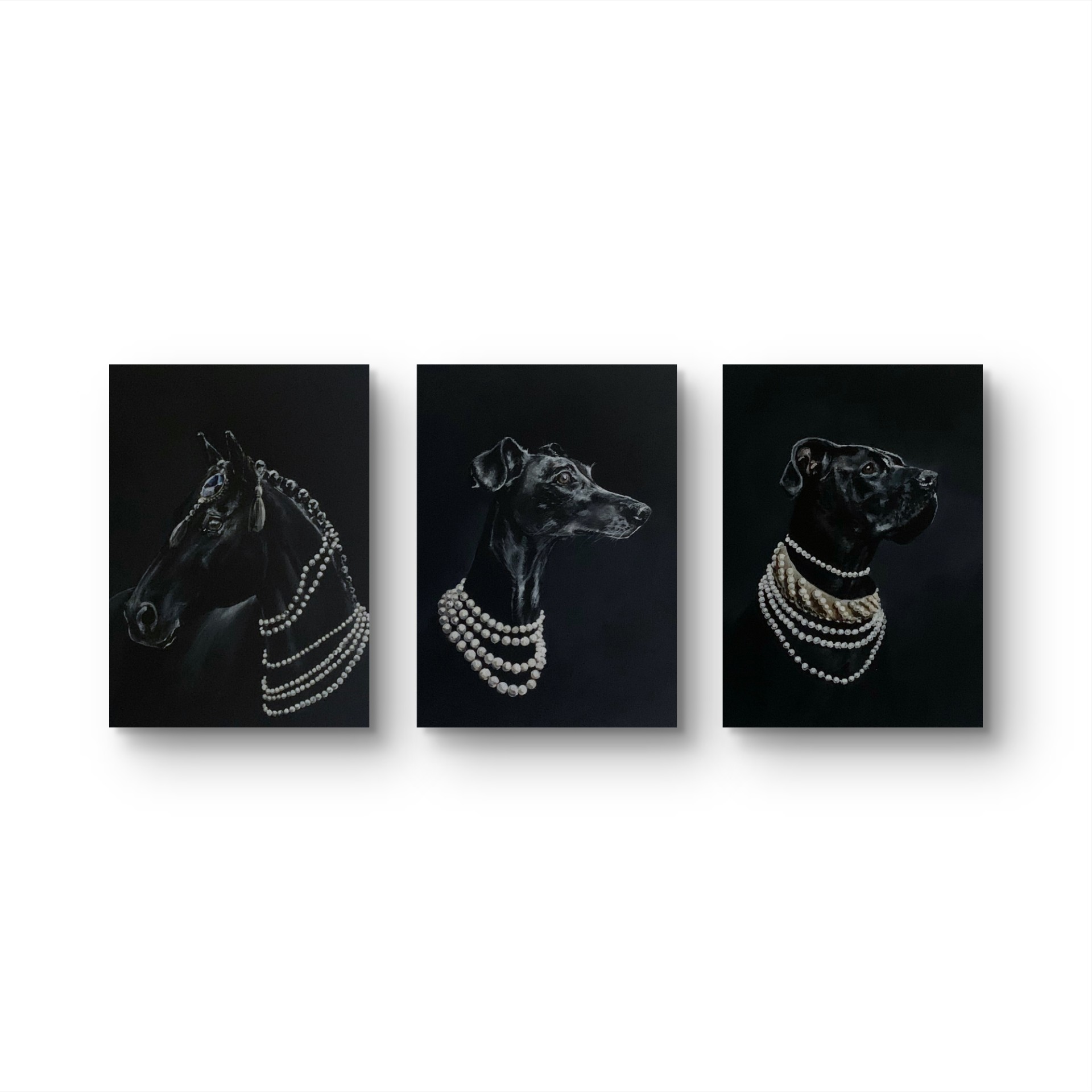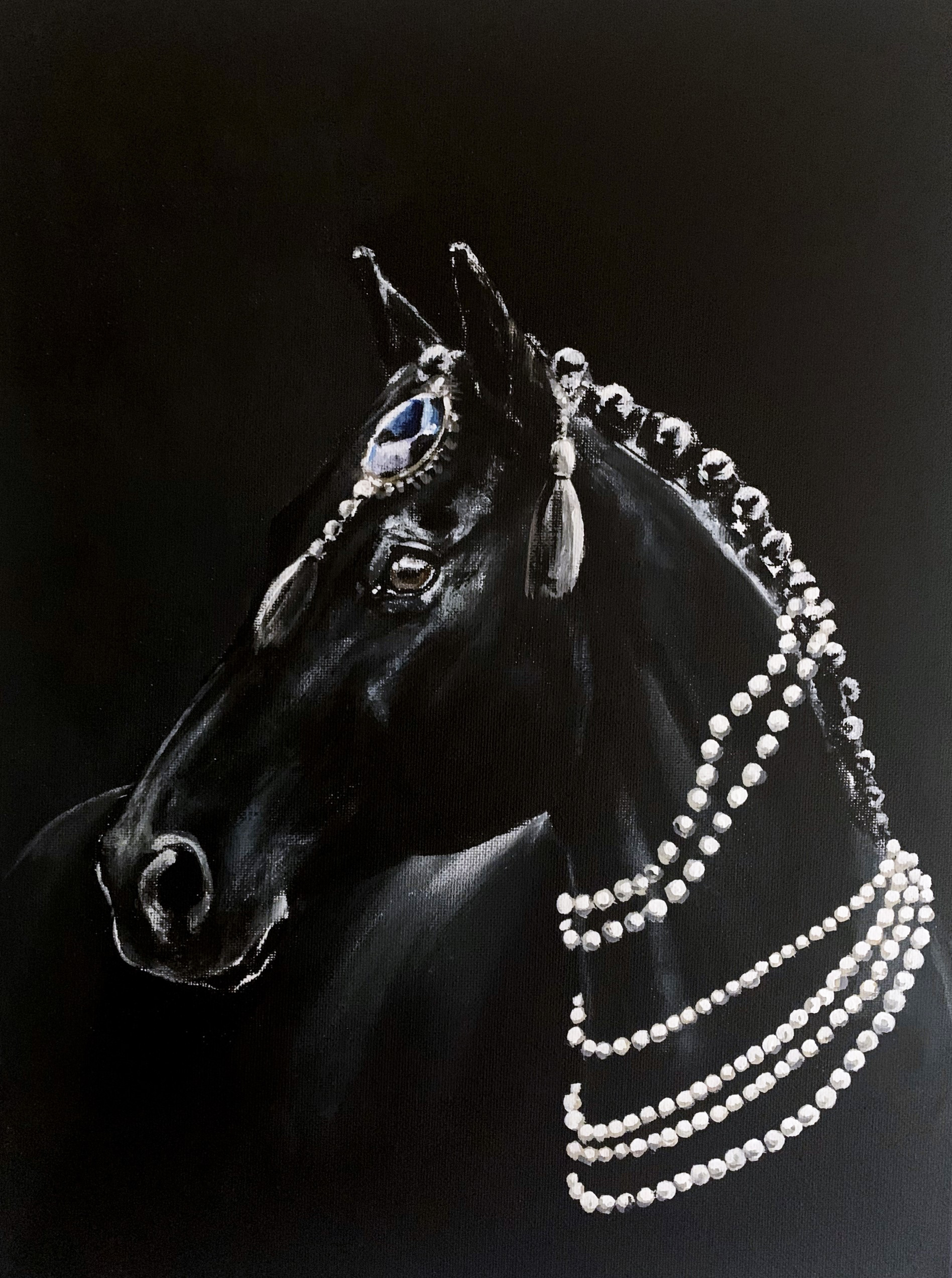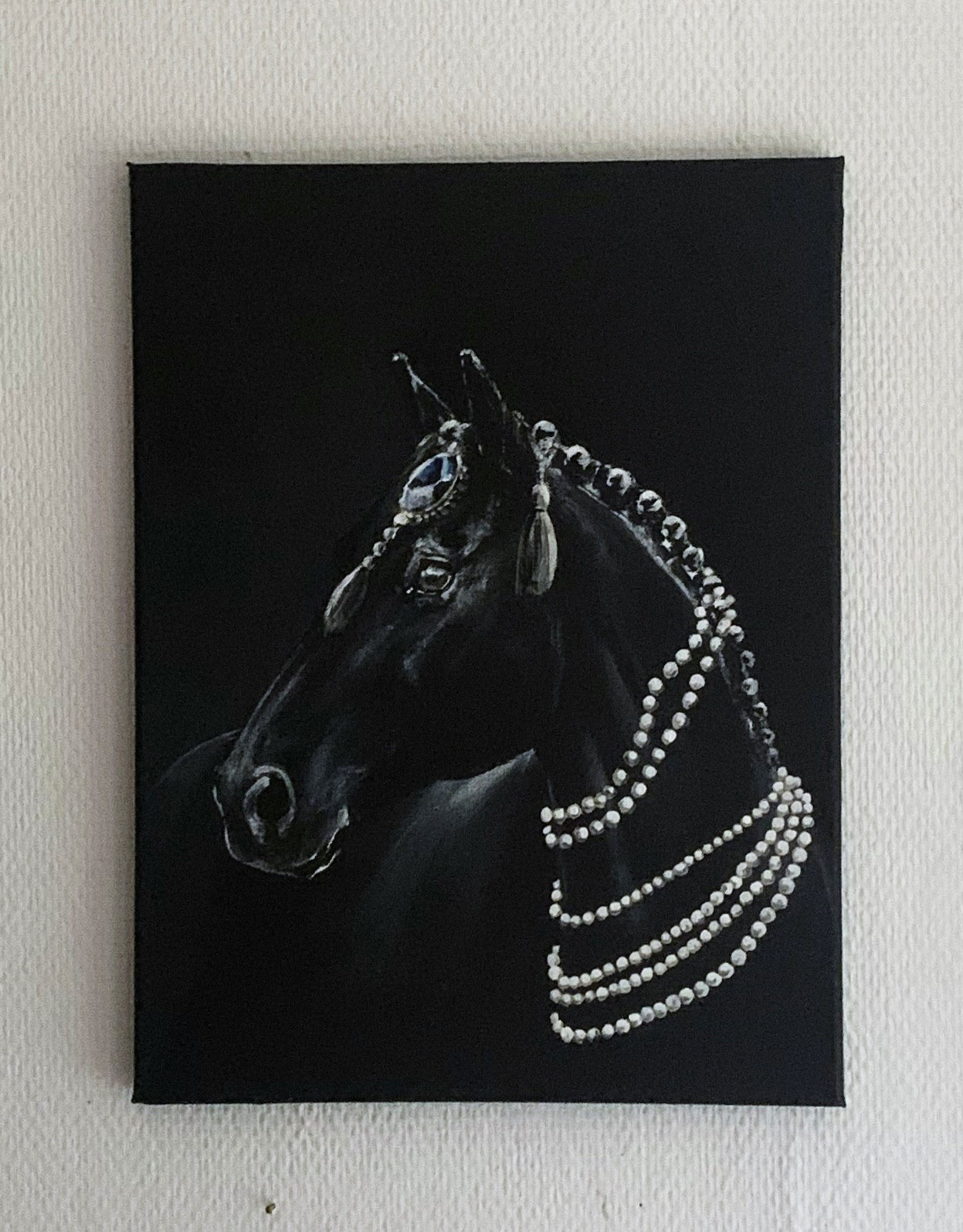 “Mind my diamonds” on 30 x 40cm maalaus canvaspohjalla, osa Hold my pearls – sarjaa jossa eläimet esiintyvät näyttävissä helmikoruissaan.
