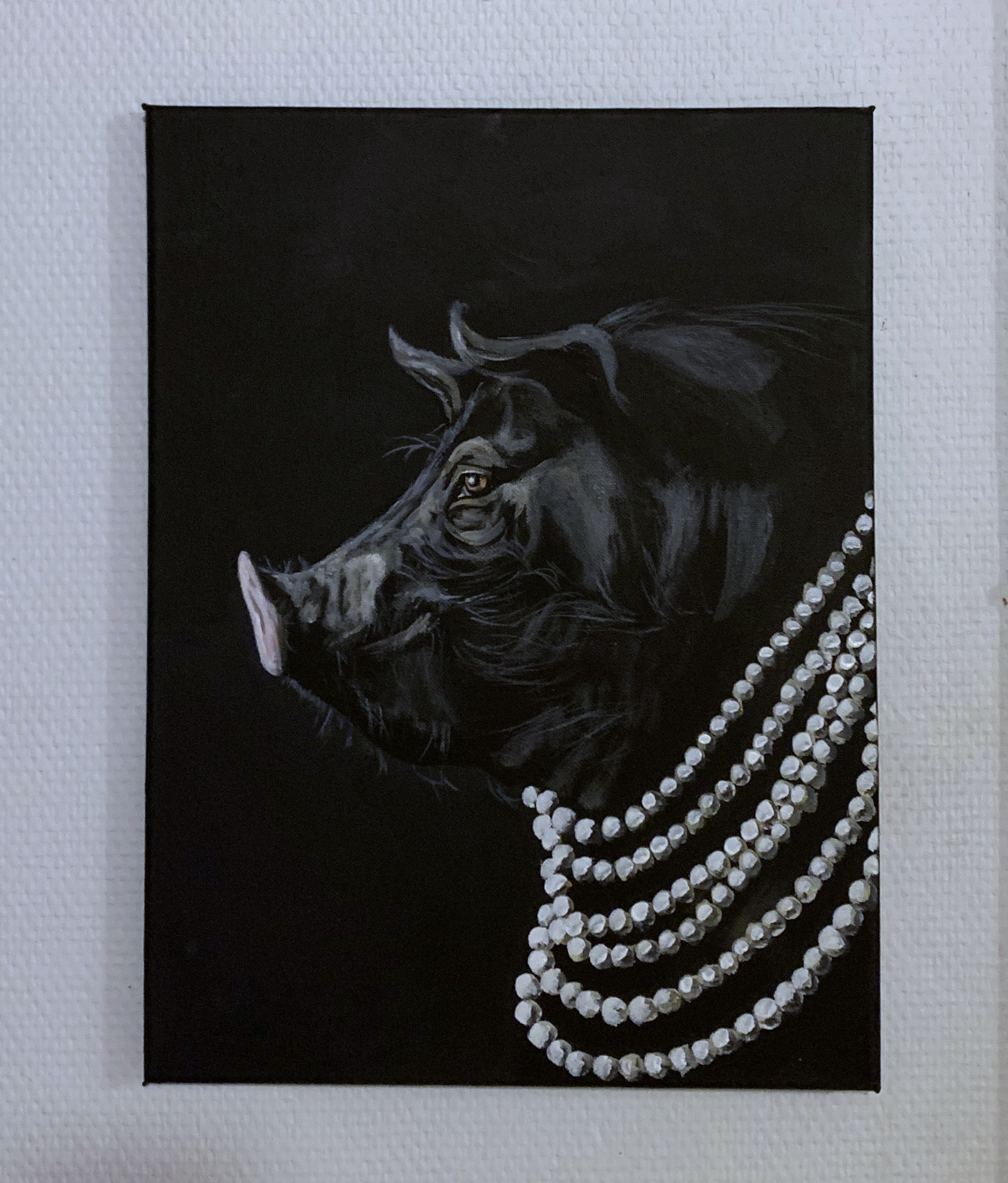 The Aristohog kuuluu Hold My Pearls -taidesarjaan, jossa eläimet nousevat päärooliin kuninkaallisina ja arvokkaina hahmoina. Tässä teoksessa musta possu on kuvattu aristokraattisena ja itsevarmana.