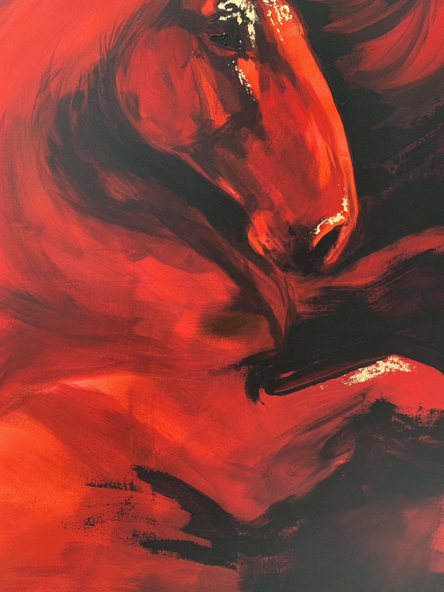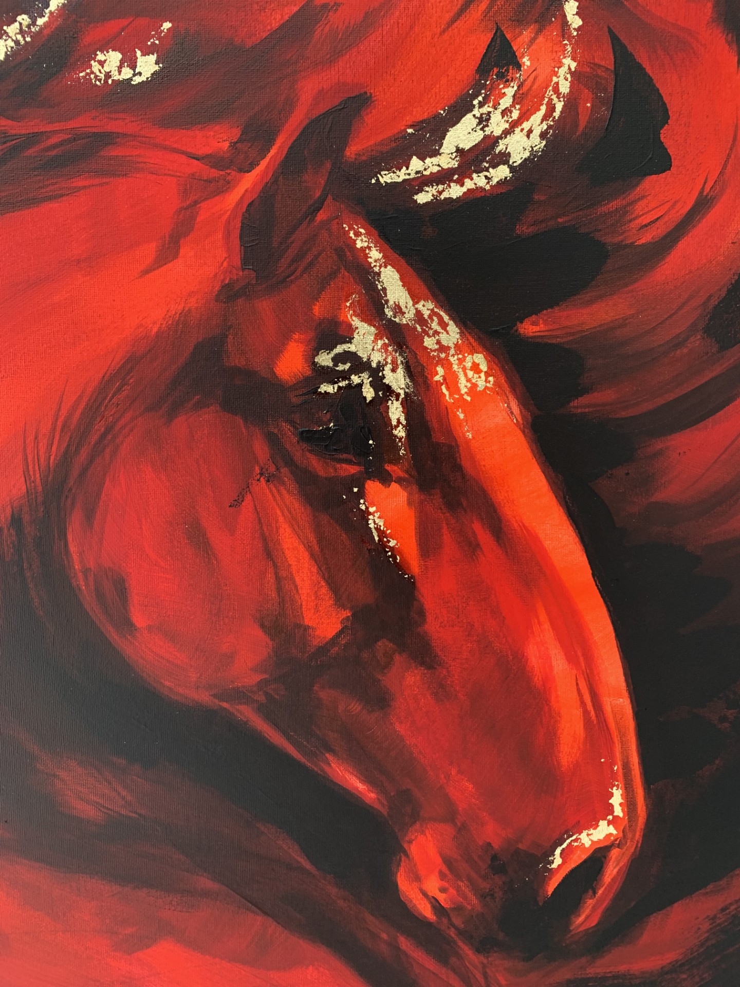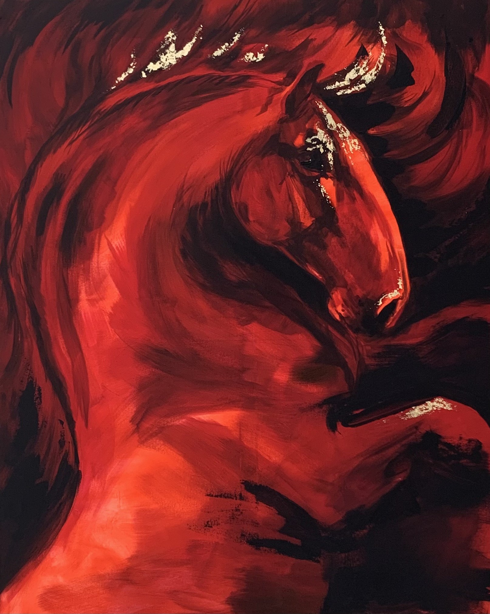 Teos kuvaa hevosta hetkenä, jossa liike on vasta syntymässä. Voima on koossa, mutta vielä hallittuna. Punaisen sävyjen ja syvien varjojen rinnalle on lisätty kultalehteä korostamaan liikkeen huippukohtia ja energian tiivistymistä.
