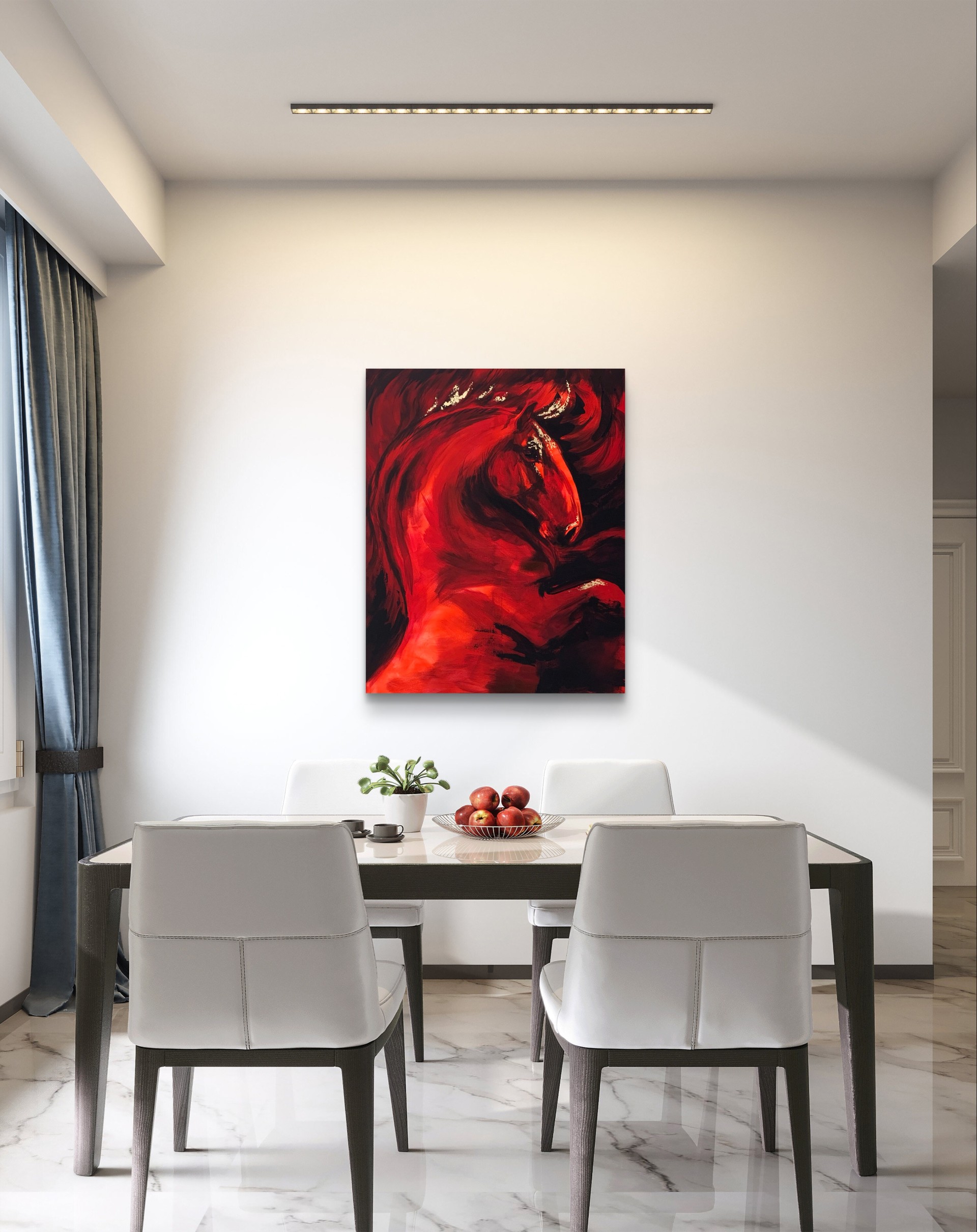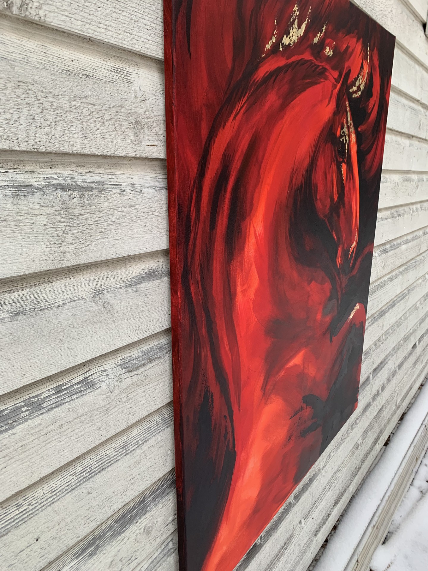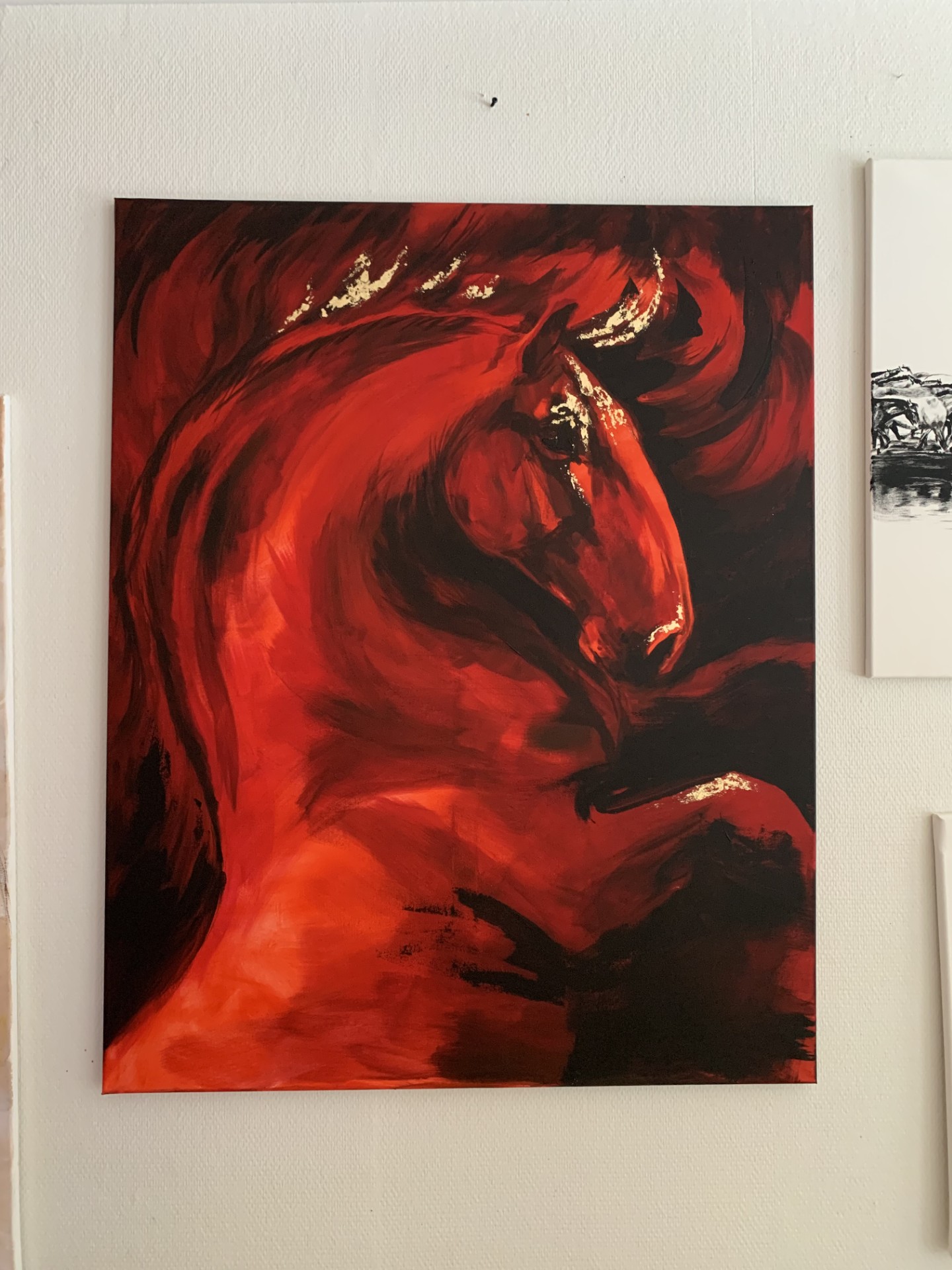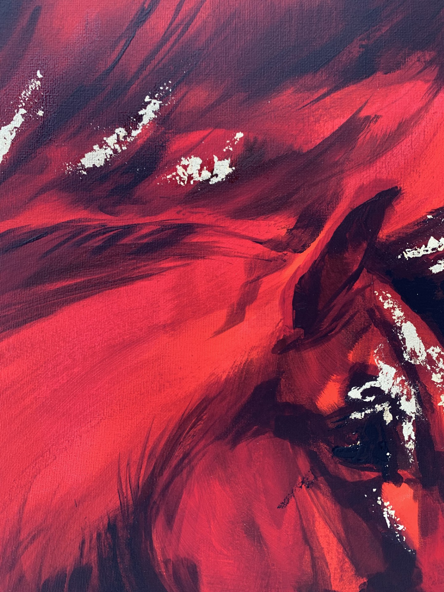 Teos kuvaa hevosta hetkenä, jossa liike on vasta syntymässä. Voima on koossa, mutta vielä hallittuna. Punaisen sävyjen ja syvien varjojen rinnalle on lisätty kultalehteä korostamaan liikkeen huippukohtia ja energian tiivistymistä.
